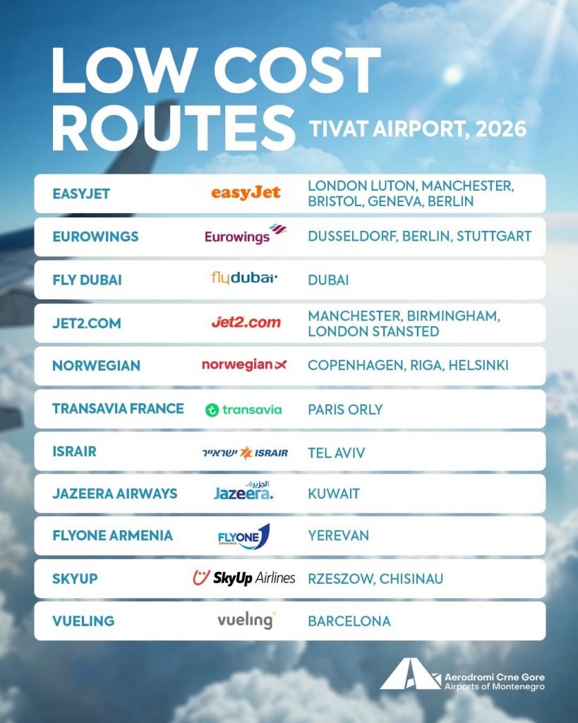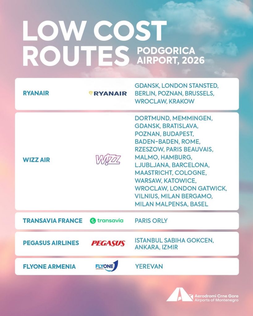 Ova mreža low-cost linija čini Crnu Goru još dostupnijom, ali i domaćim putnicima otvara vrata ka brojnim evropskim metropolama, idealnim za ljetovanje, poslovna i vikend putovanja.