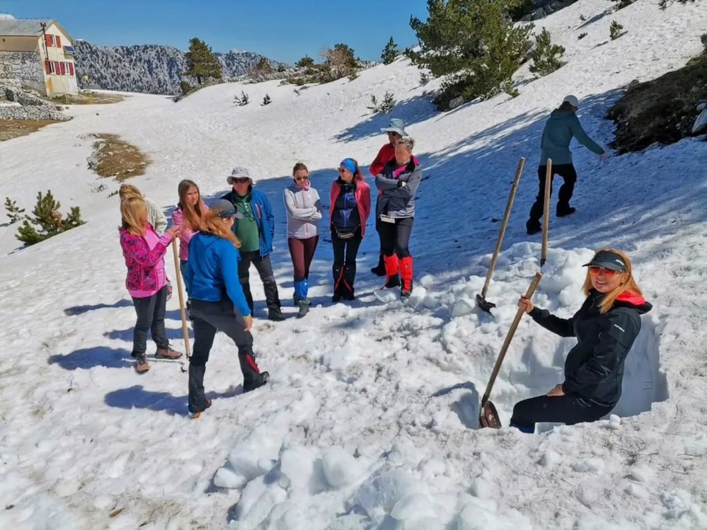 Učesnici su obišli sniježnicu koja se nalazi u blizini Orjenskog sedla, i procijenili da će se snijeg u njoj zadržati do jula.