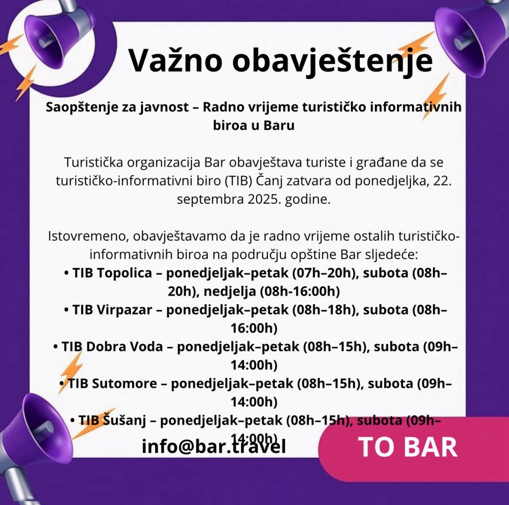 Turistička organizacija Bar obavještava turiste i građane da turističko-informativni biro (TIB) Čanj prestaje sa radom od ponedeljka, 22. septembra 2025. godine.